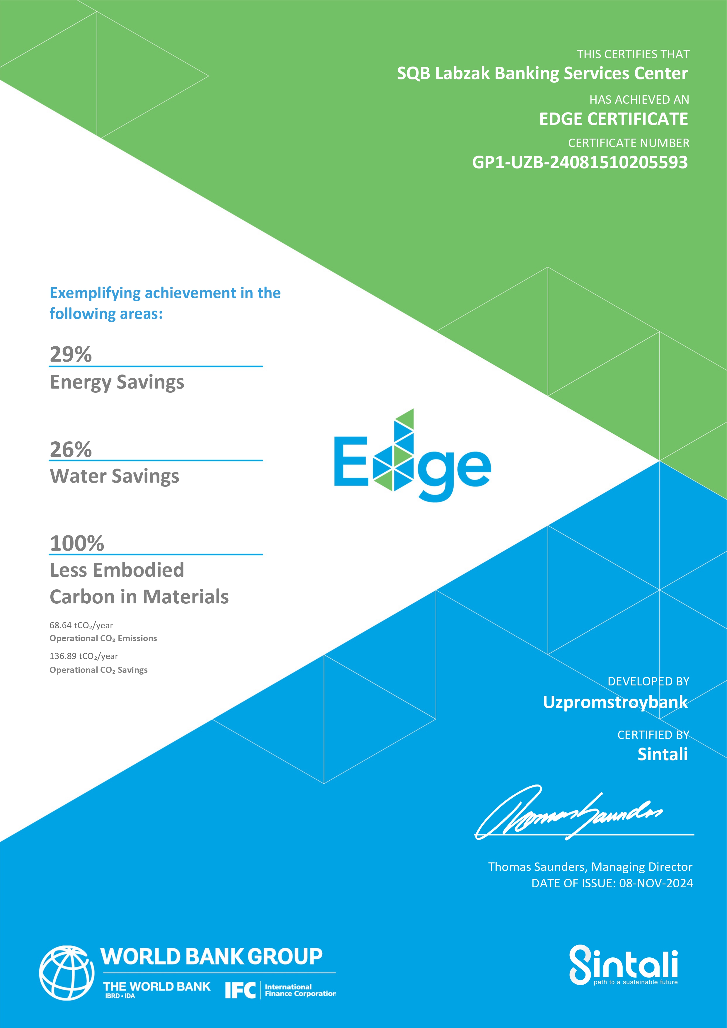 ESG siyosati va protsedurasi ishlab chiqilgan. Korporativ va chakana biznes uchun ekologik toza mahsulotlar ishlab chiqilgan