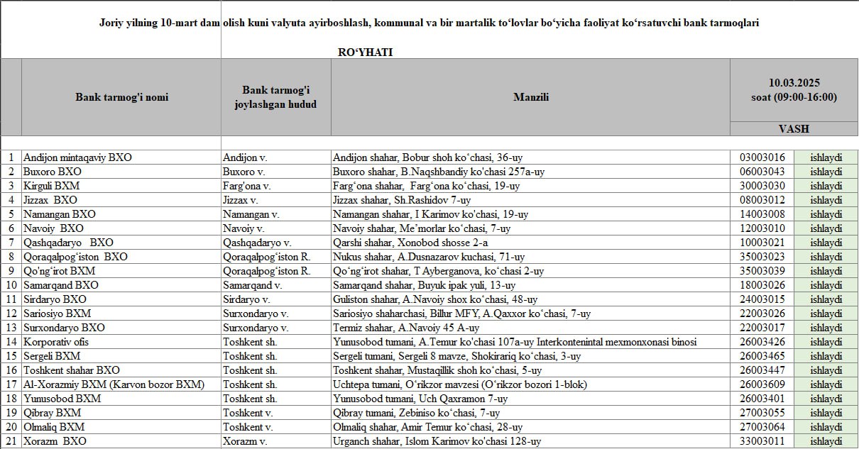 Для удобства клиентов в праздничные дни дежурные отделения АКБ "Узпромстройбанк" продолжат предоставлять следующие услуги: