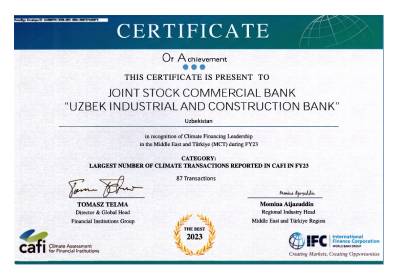 O'zbekistonda energiya tejamkor texnologiyalarni joriy etishga ko'maklashgani uchun YETTB "yil bitimi - yashil savdo" (Deal of The Year - Green Trade) mukofoti
