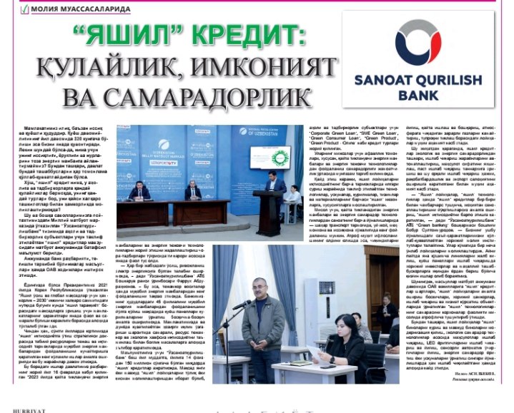 Hurmatli mijozlar! Maʼlum qilamizki, “Green komfort” kredit mahsuloti bo‘yicha ari ...